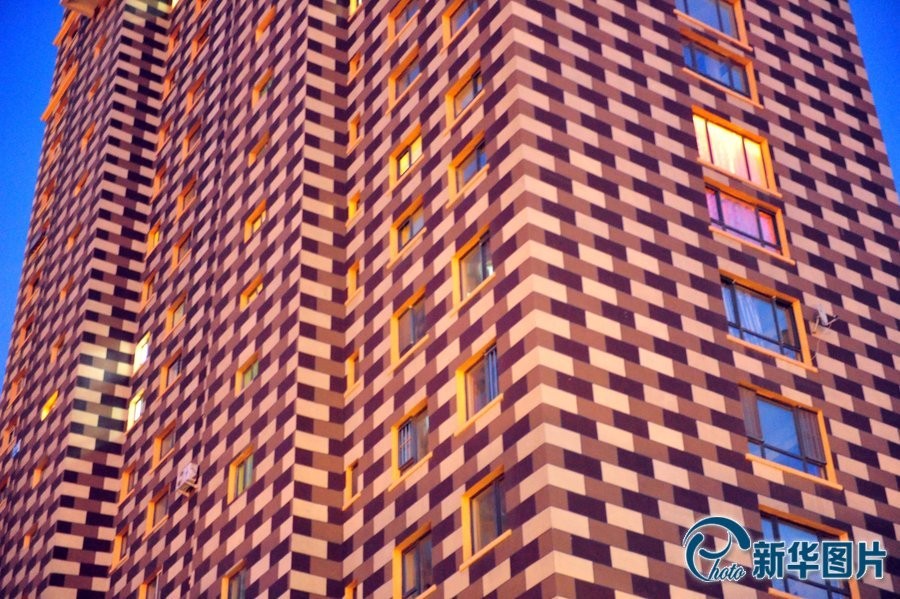 沈阳街头一座建筑外立面布满密集错落的方形格子,如同视觉解码谜题
